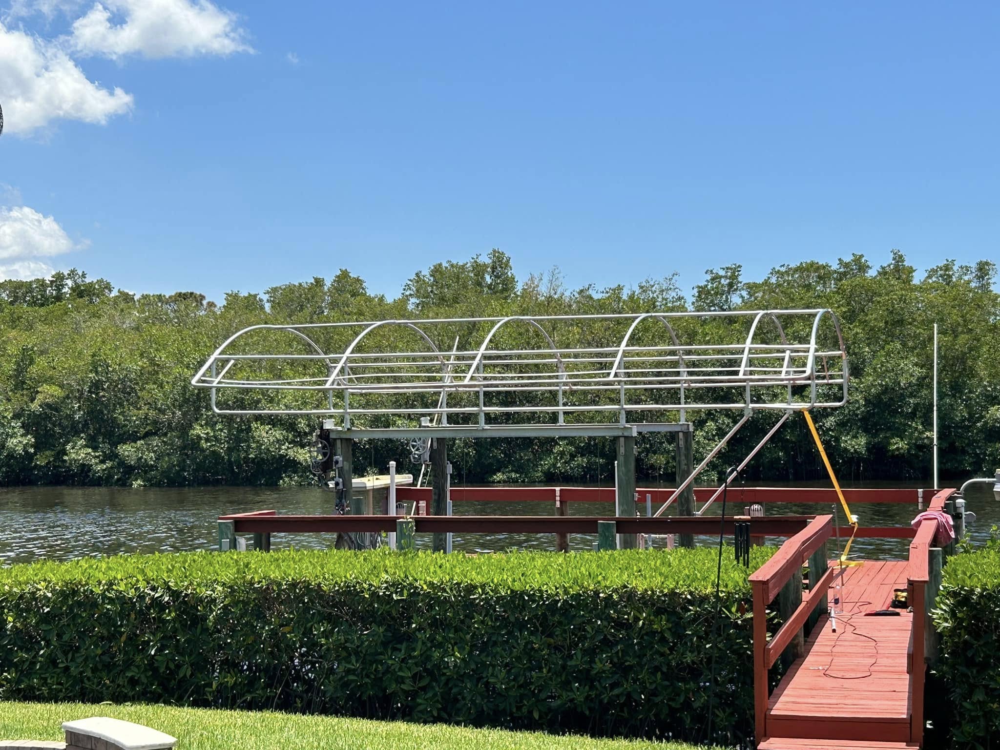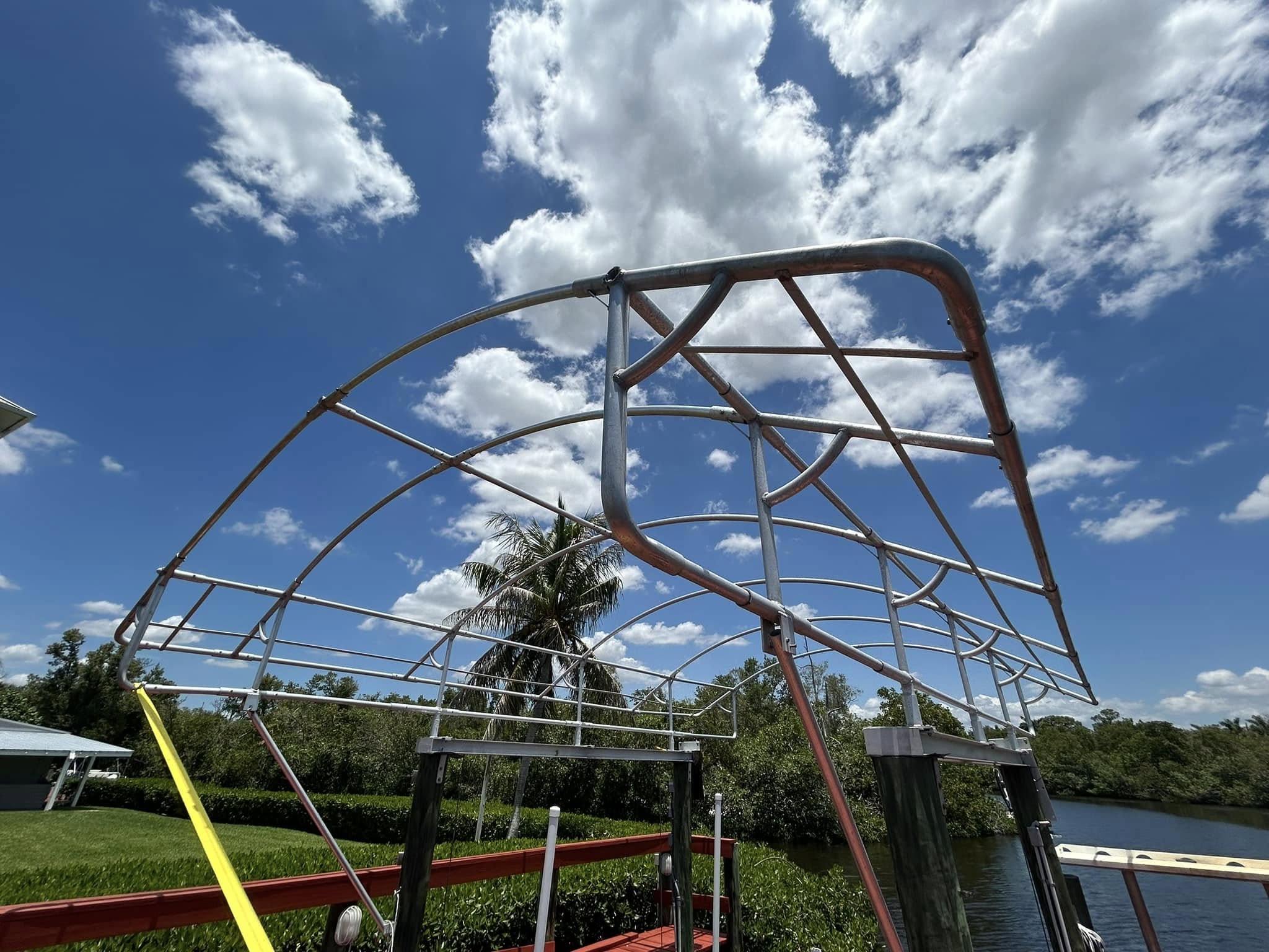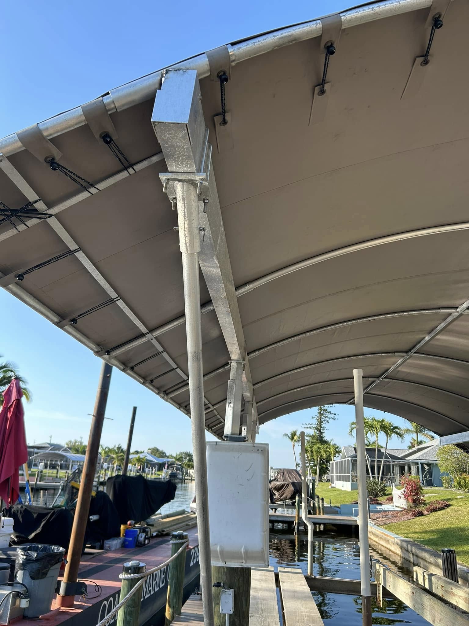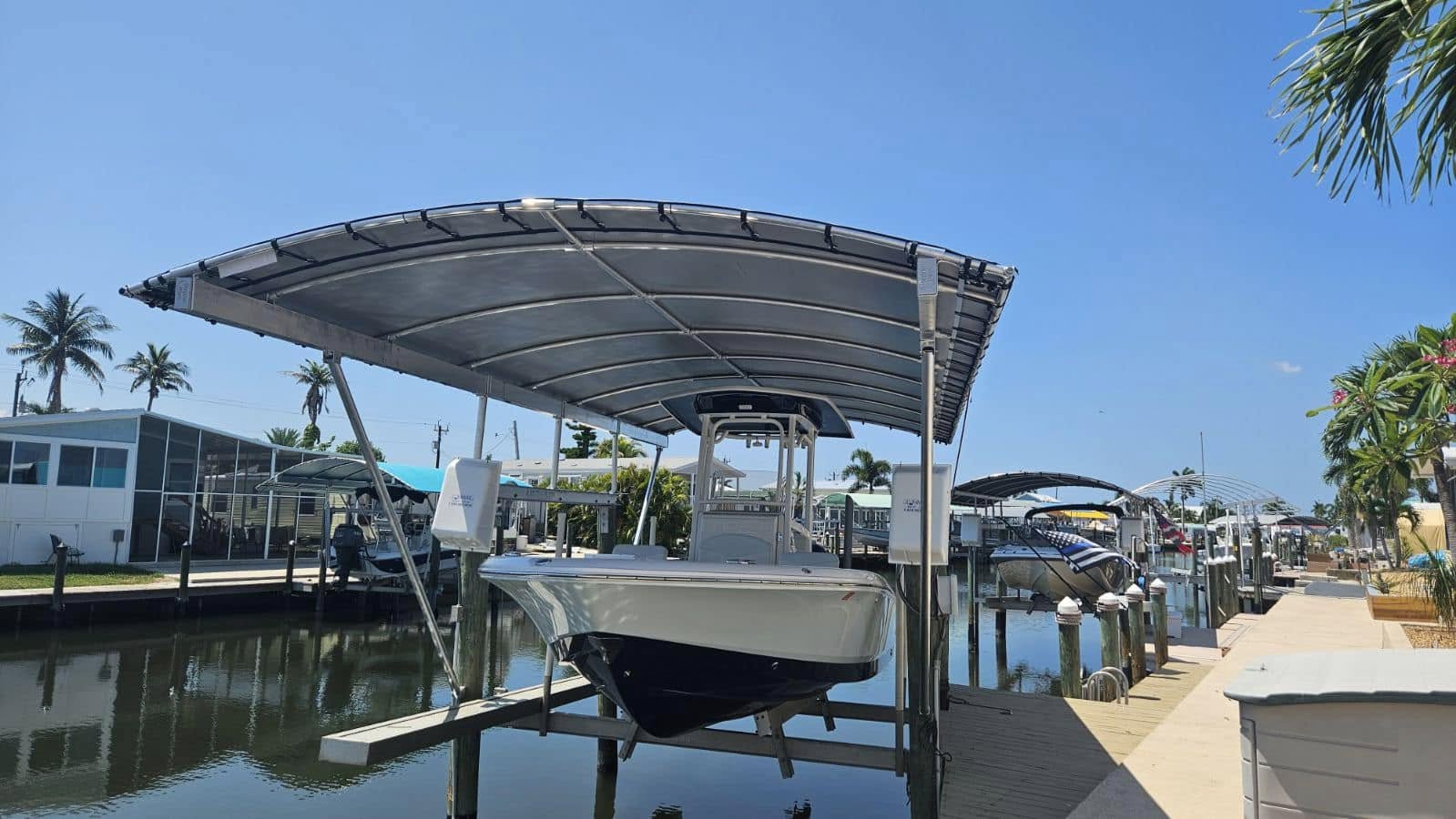 Custom aluminum boat lift canopies, flood panels, and waterfront accessories — designed, fabricated, and installed right here in Southwest Florida.