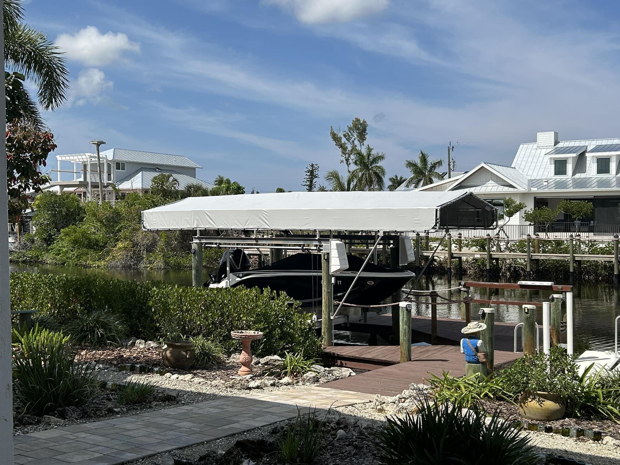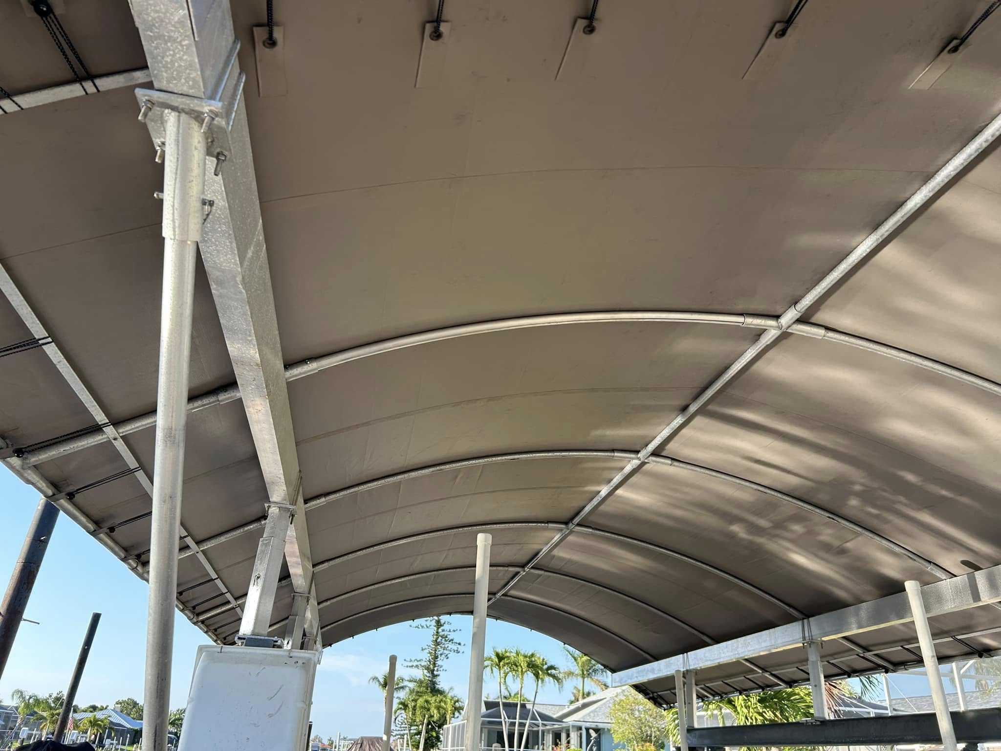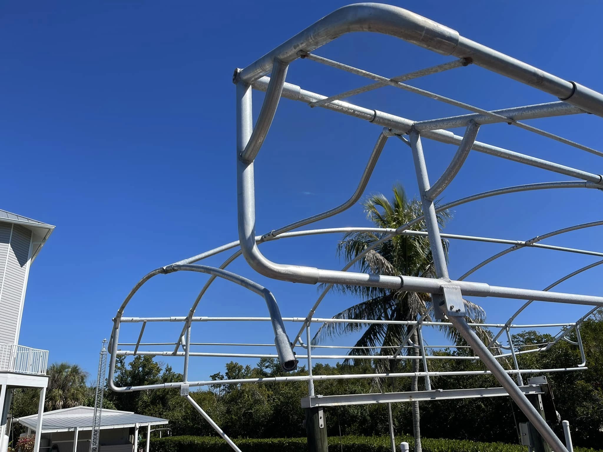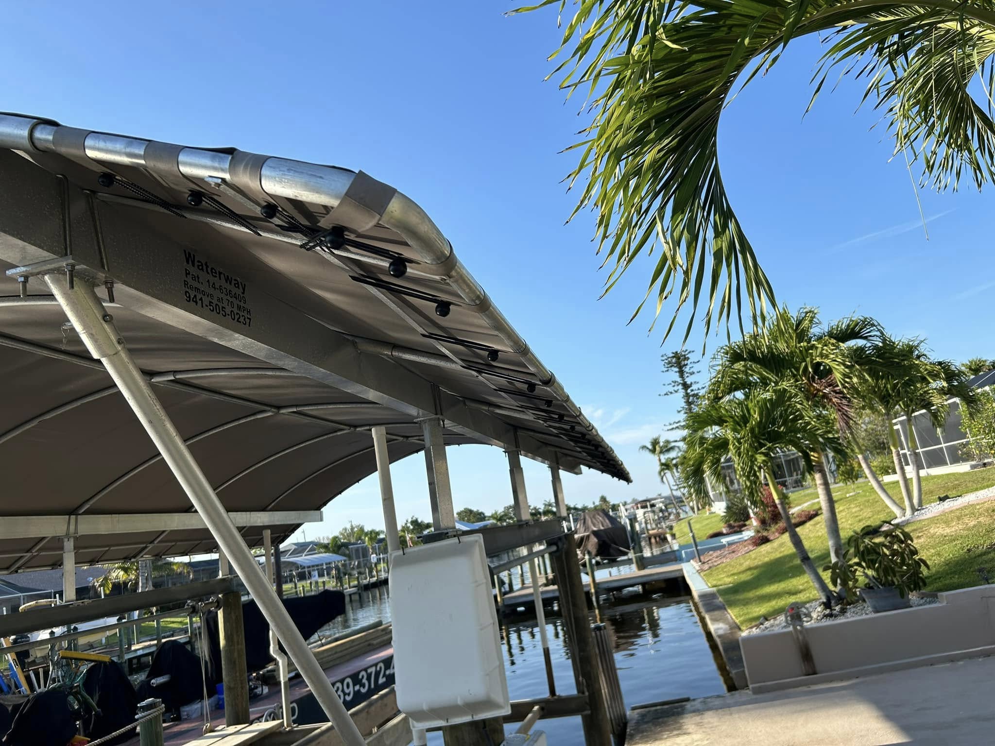 Custom aluminum boat lift canopies, flood panels, and waterfront accessories — designed, fabricated, and installed right here in Southwest Florida.
